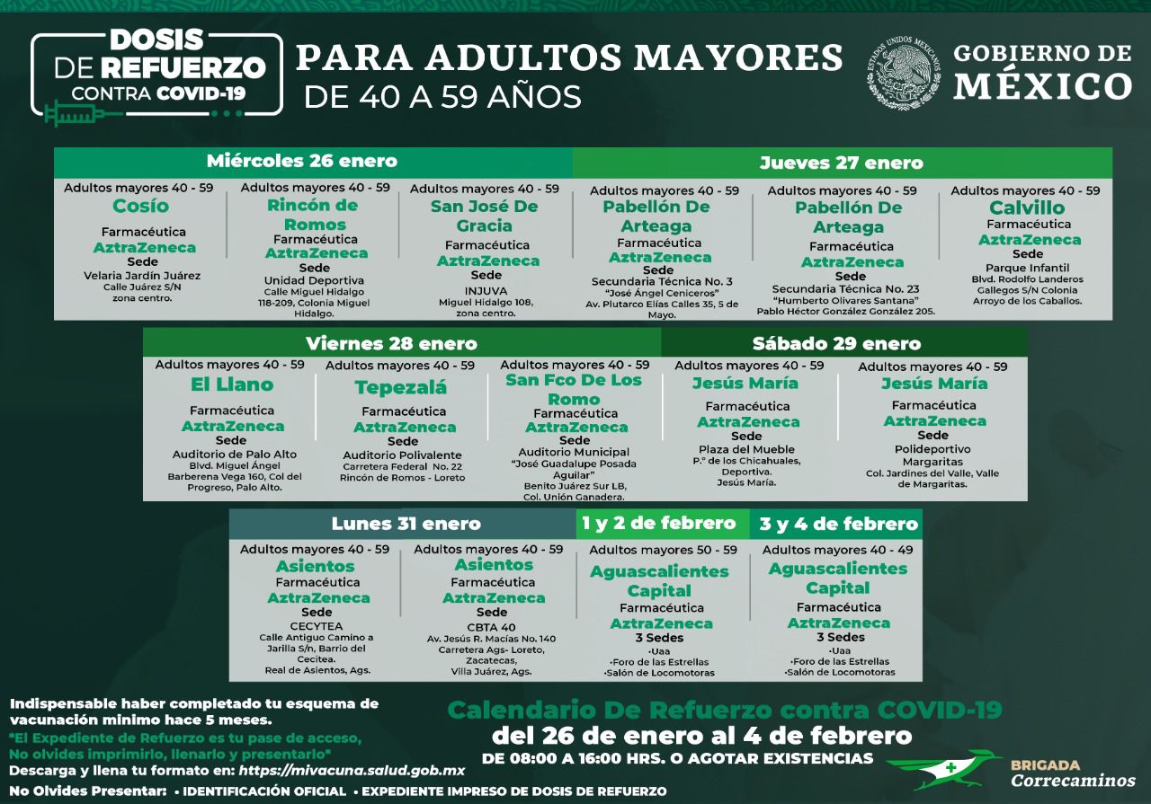 En Aguascalientes se colocará la dosis de refuerzo a las personas de 40 a 59 años que residan en este territorio. Las Brigadas Correcaminos se instalarán en los distintos municipios de la entidad del miércoles 26 de enero al viernes 4 de febrero.