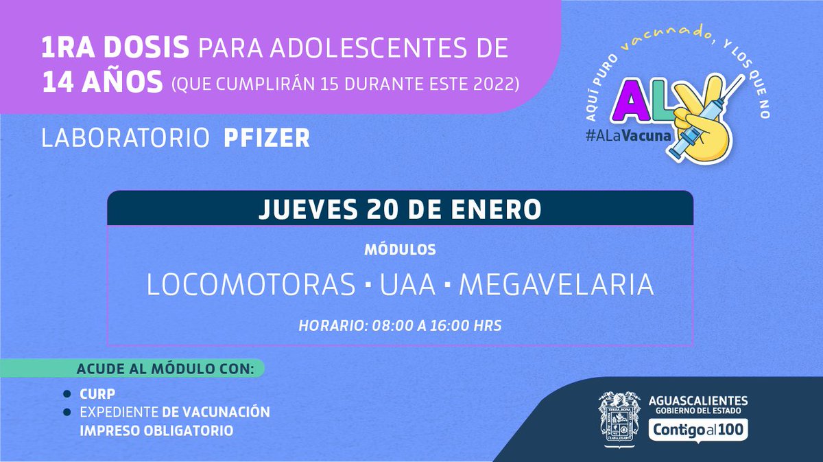 En Aguascalientes abren la convocatoria para la 1ra dosis de Pfizer en adolescentes de 14 años.