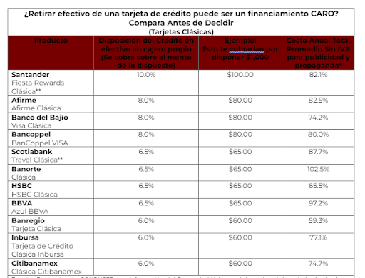 La Comisión Nacional para la Protección y Defensa de los Usuarios de Servicios Financieros (CONDUSEF) informa a la población en general sobre el costo de diferentes comisiones que cobran los bancos si retiran efectivo de sus tarjetas de crédito (tarjetas clásicas); como son: disposición del crédito en efectivo en cajero propio, anualidad, reposición del plástico por robo o extravío, gastos de cobranza y costo anual total promedio (CAT).