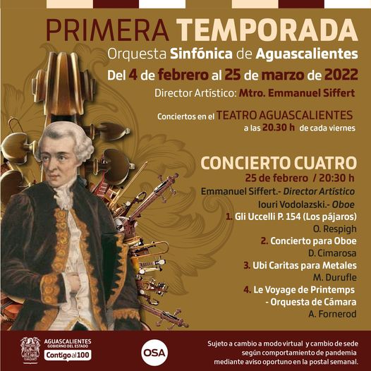 A través de sus redes sociales, el Instituto Cultural de Aguascalientes invita a todos aquellos que les gusta la música a disfrutar del 4to concierto de la Orquesta Sinfónica de Aguascalientes con un repertorio maravilloso bajo la dirección del Mtro. Emmanuel Siffert.