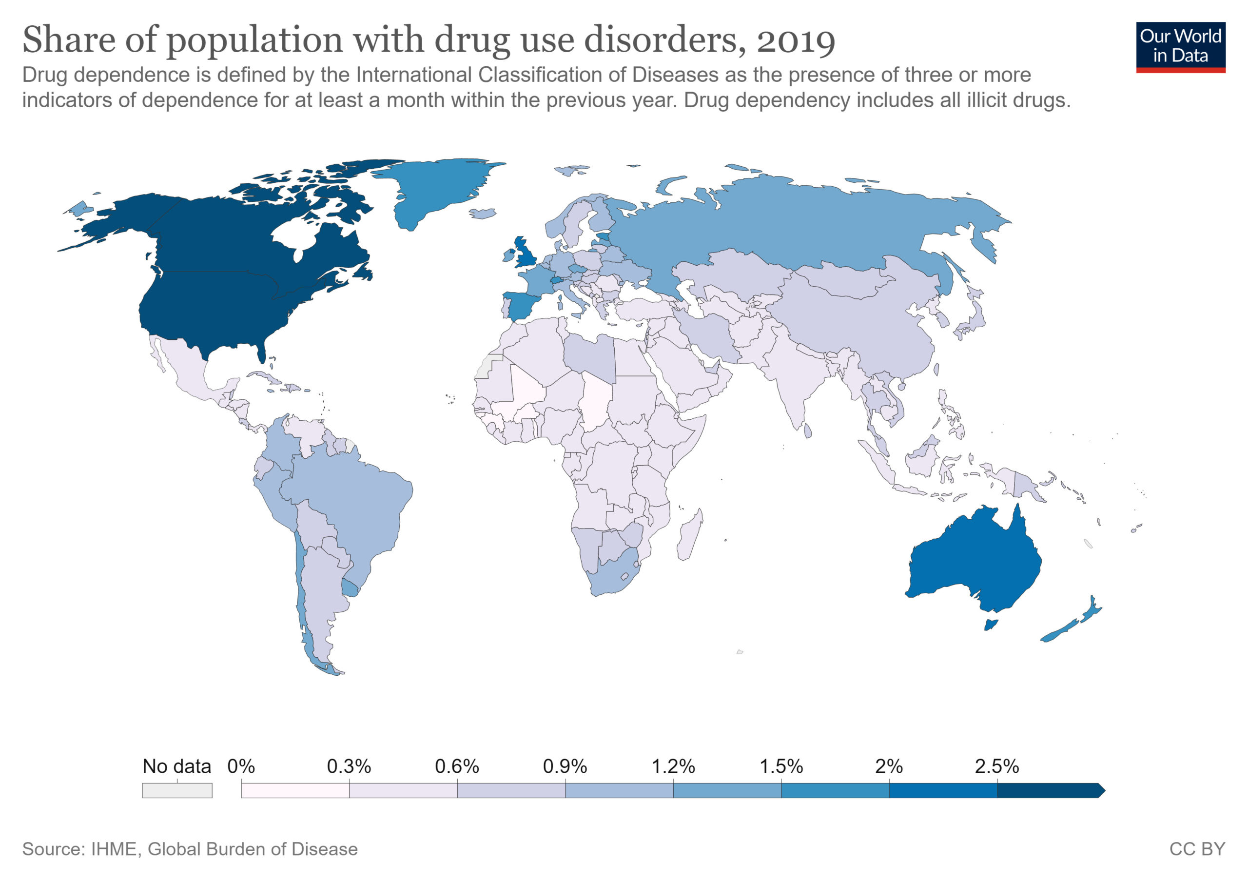 De acuerdo a datos presentados por Our World in Data, Estados Unidos y Canadá son los países que tienen mayor porcentaje de población con alguna adicción asociada al consumo de drogas en todo el mundo.