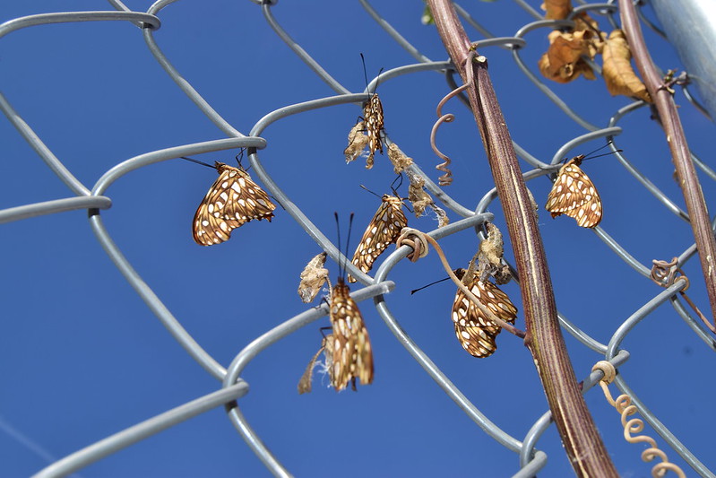 Las larvas emergen juntas y empiezan a alimentarse, crecen y se desarrollan juntas formando racimos fuertemente adheridos. Una vez alcanzado un estado maduro las larvas aún en grupo pasan al estado de pupa, crisálidas en hileras que con sorprendente parecido a las hojas secas de la planta esperan unos cuantos días para completar la transición en donde, en sincronía y al calor del sol, emergen como mariposas con alas que destellan con brillos plateados.
