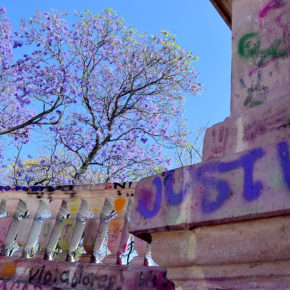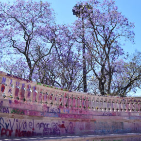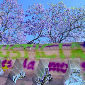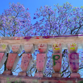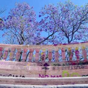 La próxima entrada a la primavera empieza a manifestarse en la vegetación haciendo que los siempre vistosos árboles de jacarandas reverdezcan su follaje y florezcan con sus distintivos tonos morados. La imagen que se genera en esta época del año en la Exedra tiene hoy un toque especial, pues aún se encuentran las pintas de las mujeres que protestaron en la manifestación del 8M con sus fuertes tonos morados y verdes, propiciando un escenario interesante para un simple acto de contemplación, sin añadir juicio alguno, solo ver, ver los contrastes de la rigidez de la cantera con las formas libres de las ramas de los árboles, compartiendo los colores, expandiendo hacia el cielo despejado el cuadro más allá de lo que el aerosol pudo pintar.