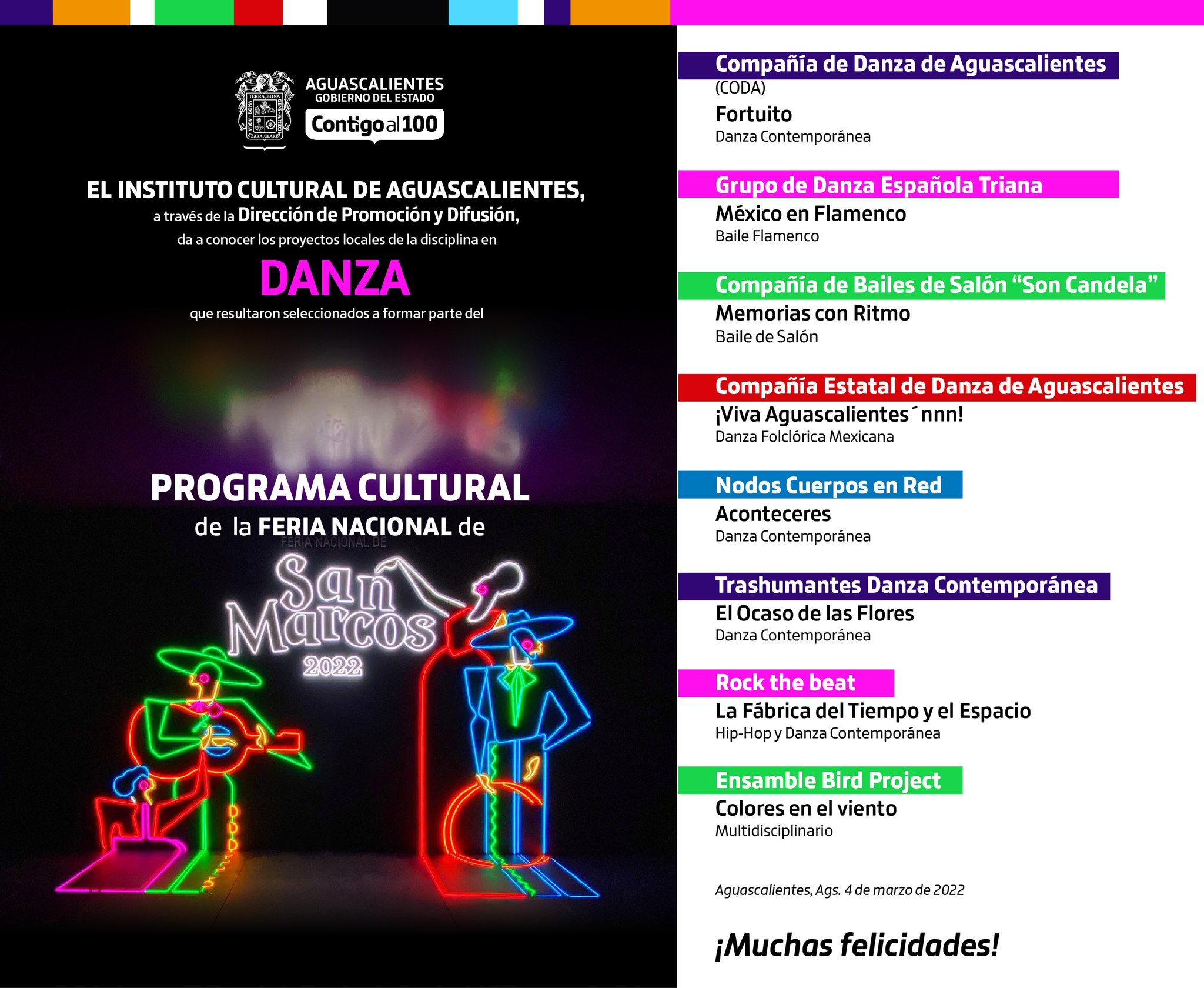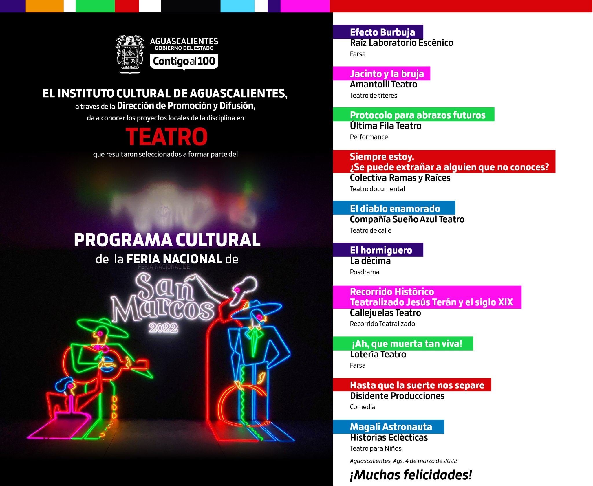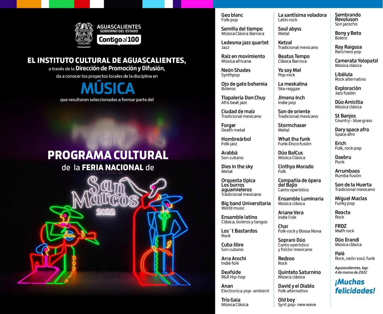 El Instituto Cultural de Aguascalientes ha publicado la lista de agrupaciones que serán parte del Programa Cultural de la Feria. Previamente se había publicado una convocatoria para que las personas que tuvieran algún proyecto cultural y tuvieran el interés de participar en este evento se inscribieran para poder ser seleccionadas.