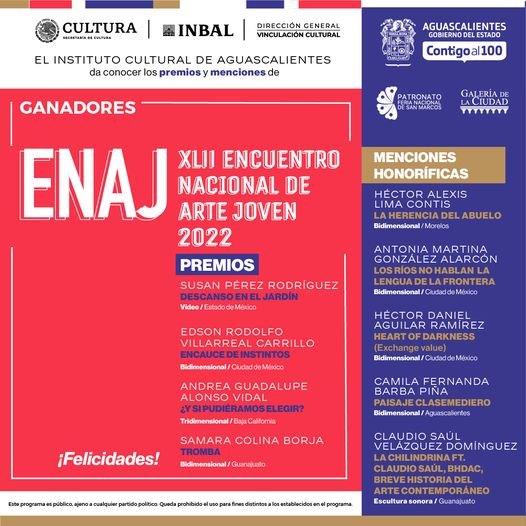 En Instituto Cultural de Aguascalientes, a travez de su página oficial de Facebook, ha presentado a los ganadores y menciones honoríficas del XLII Encuentro Nacional de Arte Joven 2022.