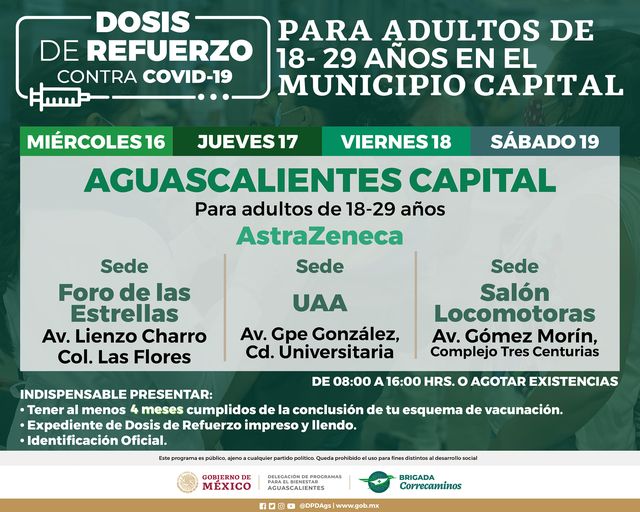 Por ello, en todo el país se están aplicando refuerzos de las vacunas contra COVID-19. En la ciudad de Aguascalientes ahora toca la aplicación para personas mayores de 18 años, convocando a todas aquellas que aún no reciben su refuerzo.