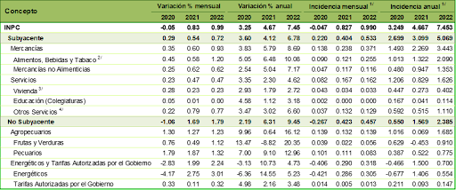 En marzo de 2022, el Índice Nacional de Precios al Consumidor (INPC) presentó una variación de 0.99% respecto al mes anterior. Con este resultado, la inflación general anual se ubicó en 7.45%. En igual mes de 2021, la inflación mensual fue de 0.83% y la anual de 4.67%.