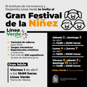 El Municipio de Aguascalientes invita a celebrar a los pequeños en el Mes de la Niña y el Niño, del 1 al 10 de abril.  El Instituto de Convivencia y Desarrollo Línea Verde preparó un festival en el que habrá diversión y sano esparcimiento, con actividades y talleres exclusivos.