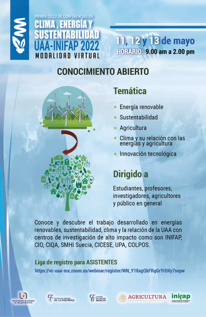 La Universidad Autónoma de Aguascalientes, a través del Centro de Ciencias de la Ingeniería y el Centro de Ciencias Básicas, invita a participar del Primer Ciclo de Conferencias en Clima, Energía y Sustentabilidad en el que podrán inscribirse alumnos, profesores, investigadores, agricultores y público en general.