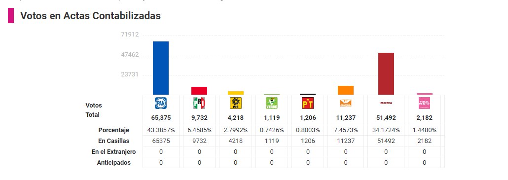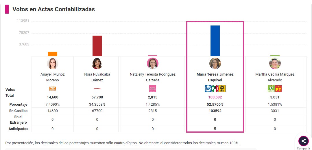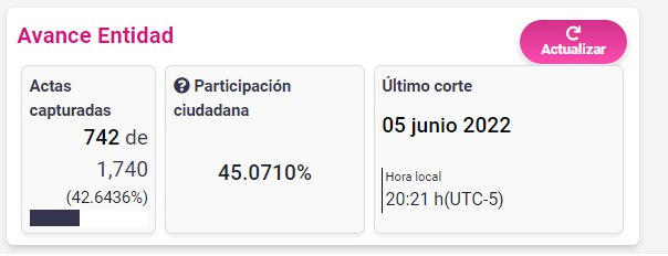 AguascalientesCentral Electoral 2022 Actualizado: 05/06/2022 Así va el PREP al 42% a la gubernatura de Aguascalientes 2022 Por Staff 05/06/2022 Share FacebookTwitterPinterestWhatsApp Staff Te podría interesar AguascalientesRuben Aguilar - 04/12/2025La presidenta y su concepción del pasado | Convicciones por: Rubén Aguilar Valenzuela AguascalientesStaff - 04/12/2025Policía municipal refuerza la vigilancia aérea durante temporada decembrina AguascalientesRedacción - 03/12/2025Proponen castigar el abuso financiero contra mujeres en Aguascalientes AguascalientesStaff - 02/12/2025A más de 40 años del VIH en México persisten altas cifras de contagio y discriminación Corte al 42.6% del PREP Participación Ciudadana 45.0% Se han capturado 362 actas, de las cuales: 52.5% – Tere Jiménez 34.3% – Nora Ruvalcaba 7.4% – Anayeli Muñoz 1.4% – Natzielly Rodríguez 1.5% – Martha Márquez Votos nulos: 2.6% Tagselecciones 2022 Share FacebookTwitterPinterestWhatsApp RELACIONADOS ¿La nueva Ley de Extorsión pone en riesgo las libertades informativas? APRO APRO - 05/12/2025 0 Los funcionarios públicos, por su propia naturaleza y por el cargo que ocupan, están bajo escrutinio. La crítica (cuando es verídica, razonada y... Read more La dupla Sheinbaum-Godoy: del control en la CDMX al Poder Judicial nacional APRO APRO - 05/12/2025 0 La ratificación de Godoy en el Senado abre la posibilidad de que se repita la fórmula política que aplicó junto a Claudia Sheinbaum... Read more Una nueva fiscal: Ernestina Godoy APRO APRO - 05/12/2025 0 Alejandro Gertz Manero, como embajador, nos va a representar dignamente. Se habla de que será enviado a Alemania, lugar de origen de sus... Read more Sheinbaum se reunirá con Trump en su viaje para el sorteo del Mundial 2026 APRO APRO - 05/12/2025 0 La presidenta también tendrá un encuentro con el primer ministro de Canadá, Mark Carney, donde podrían tratar temas como el T-MEC La presidenta Claudia... Read more No hay razón para bloqueos en cruces internacionales: Secretaría de Gobernación Sociedad y Justicia Staff - 05/12/2025 0 SEGOB afirmó que ya atendió planteamientos de productores sobre la nueva Ley de Aguas y mantiene mesas permanentes de diálogo El Gobierno federal... Read more La coordinación estatal de becas para el bienestar informó avances del operativo de entrega de tarjetas Sociedad y Justicia Staff - 05/12/2025 0 42.12% de avance en reposiciones de tarjetas Operativos en 192 escuelas y más de 14 mil tarjetas por entregar Expansión histórica del programa... Read more Previous articleJuegos de pelota/ A lomo de palabra Next articleMini guía: pueblos mágicos cercanos a Aguascalientes (tercera parte)/ Así es esto - Advertisement - - Advertisement - Recientes en LJA.MX APROAPRO - 05/12/2025¿La nueva Ley de Extorsión pone en riesgo las libertades informativas? Los funcionarios públicos, por su propia naturaleza y por el cargo que ocupan, están bajo escrutinio. La crítica... APRO La dupla Sheinbaum-Godoy: del control en la CDMX al Poder Judicial nacional APRO - 05/12/2025 APRO Una nueva fiscal: Ernestina Godoy APRO - 05/12/2025 APRO Sheinbaum se reunirá con Trump en su viaje para el sorteo del Mundial 2026 APRO - 05/12/2025 Sociedad y Justicia No hay razón para bloqueos en cruces internacionales: Secretaría de Gobernación Staff - 05/12/2025 - Advertisement - MÁS INFORMACIÓN EN LJA.MX Se interpusieron más de 100 quejas hasta antes de la entrega de la constancia de mayoría Política Claudia Rodríguez Loera - 15/06/2022 Presenta Morena 18 impugnaciones a la elección del 5 de junio, una por distrito electoral Política Claudia Rodríguez Loera - 15/06/2022 Así va el PREP al 81% a la gubernatura de Aguascalientes 2022 Aguascalientes Staff - 05/06/2022 Reconoce Anayeli Muñoz crecimiento exponencial de Movimiento Ciudadano en Aguascalientes Aguascalientes Staff - 05/06/2022 - Advertisement -