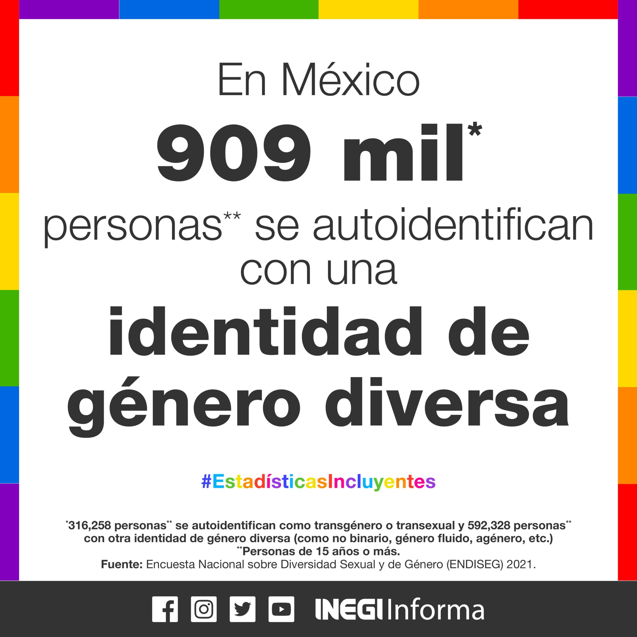 Pasando a la identidad de género, 908.6 mil personas afirma que esta es disidente a la asignada al nacer. En consecuencia, 0.9% de la población mexicana considera que su identidad es transgénero, transexual, no binaria, género fluido, entre otras.