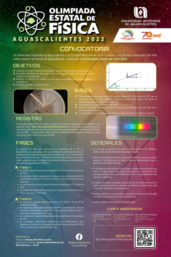 Convoca la Universidad Autónoma de Aguascalientes de la mano de la Sociedad Mexicana de Física a alumnos de educación media superior a participar en la Olimpíada Estatal de Física 2022, concurso que tiene por objetivo despertar el interés en la materia y desarrollar en los estudiantes habilidades de observación y pensamiento científico, así como, identificar talentos con vocación para encaminarlos a las carreras que les permitan aplicar sus destrezas.
