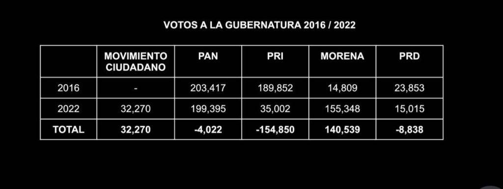 De 189,852 votos en 2016, pasaron a 35,002 votos en 2022. Estos son 154,850 votos menos.