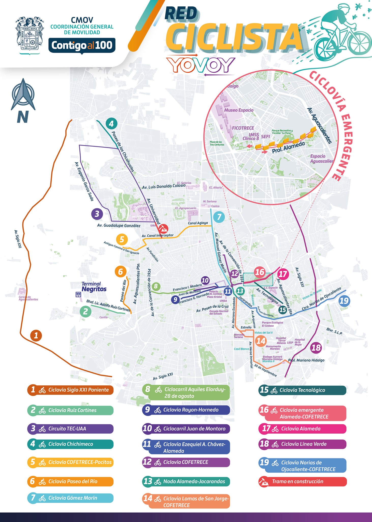 A continuación te mostramos un mapa con la red de ciclovías YoVoy de la ciudad de Aguascalientes, la cual cuenta con varios circuitos y zonas diseñadas específicamente para el transporte en bicicleta.