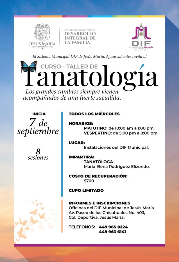 El DIF Municipal de Jesús María, invita a la población que así lo desee, al Curso Taller de Tanatología, ello con el objetivo de seguir impulsando el bienestar de las personas que han sufrido alguna pérdida.