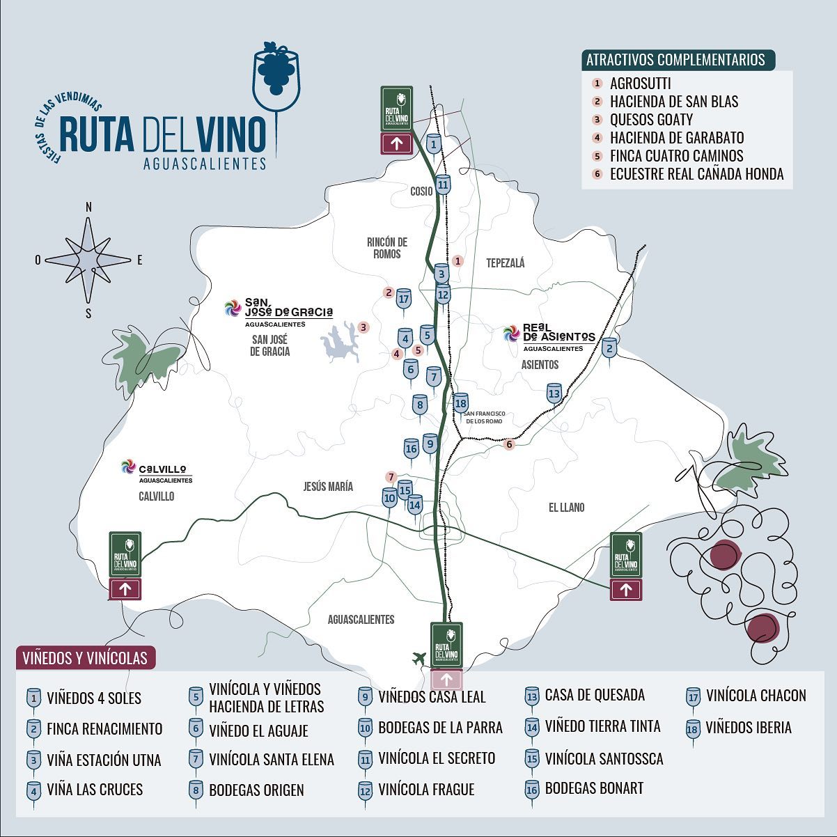 Para que no te pierdas ninguno de estos eventos y puedas conocer lo mejor de la vitivinicultura de Aguascalientes, dejamos el mapa con todas las ubicaciones, bodegas y viñedos que estarán participando en la Ruta del Vino 2022.