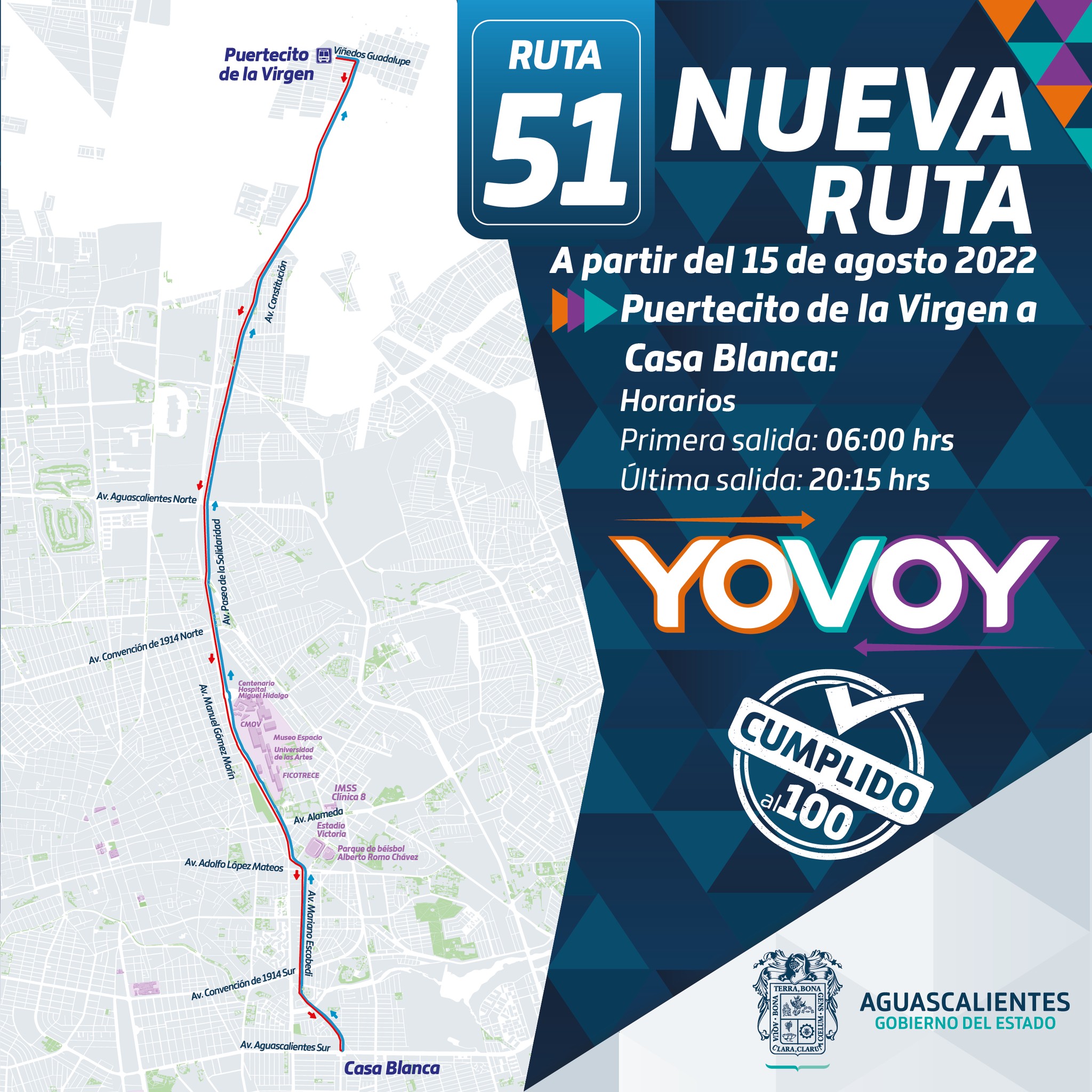 La nueva ruta es la número 51, la cual atravesará de norte a sur y viceversa la ciudad de Aguascalientes, por el nororiente de la misma. Cabe recordar que en este municipio habita cerca del 70% de toda la población de la entidad, por lo cual las necesidades de transporte son amplias.