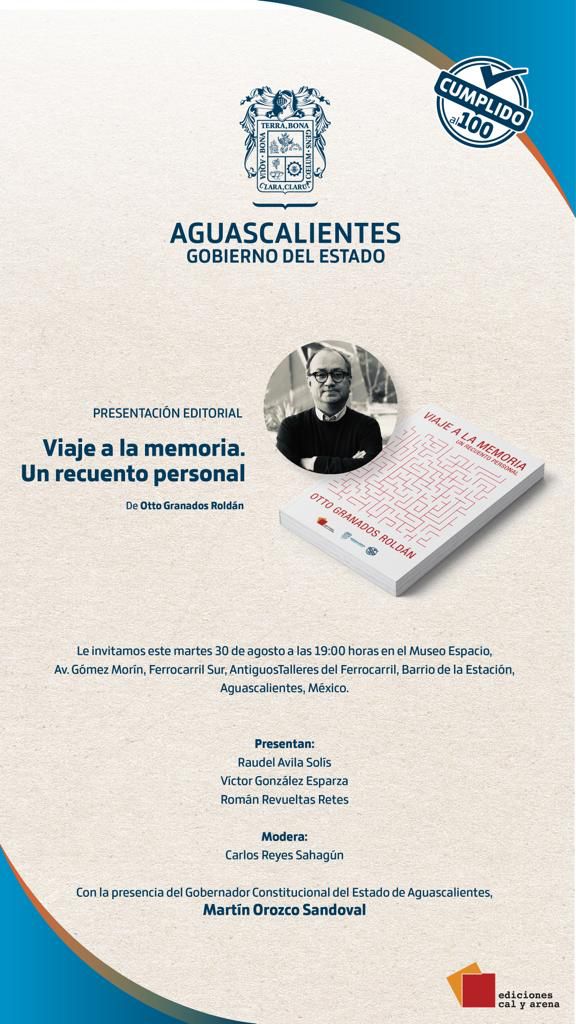 Como parte de las acciones de difusión del patrimonio histórico y cultural de la entidad, el Instituto Cultural de Aguascalientes (ICA), en colaboración con Ediciones Cal y Arena, hospeda la presentación del libro Viaje a la memoria. Un recuento personal, obra de Otto Granados Roldán, ex gobernador de la entidad y destacado autor.