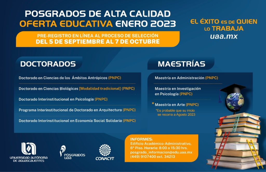 Con el objetivo de continuar formando especialistas que contribuyan a resolver problemáticas y necesidades del mundo actual, la Universidad Autónoma de Aguascalientes oferta cinco opciones de doctorado y dos de maestría de alta calidad para todos aquellos que quieran formar parte de la nueva generación que dará inicio en enero de 2023.