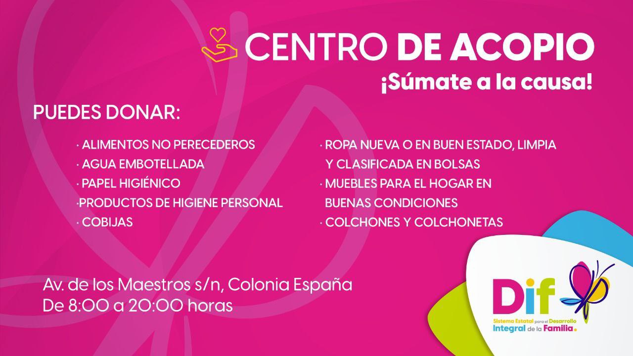Para ayudar a las personas afectadas por esta explosión, el DIF Estatal ha dispuesto un centro de acopio en sus instalaciones ubicadas en Avenida de los Maestros S/N, Colonia España.