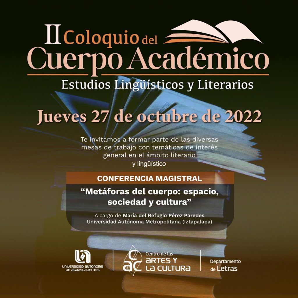 A fin de dar a conocer la investigación que se realiza al interior del cuerpo académico, la Universidad Autónoma de Aguascalientes a través del Departamento de Letras del Centro de las Artes y la Cultura, realizará este próximo 27 de octubre de 2022, el II Coloquio del Cuerpo Académico “Estudios Lingüísticos y Literarios” cuya línea de aplicación y generación de conocimiento es la literatura, lengua e interculturalidad.