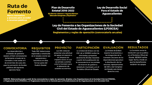 En Aguascalientes, según la LFOSCEA, corresponde a la Secretaría de Desarrollo Social, a través de la Comisión de Fortalecimiento coordinar las acciones de fomento y asignar los recursos monetarios y en especie; para ello, es necesario que las organizaciones estén legalmente constituidas y registradas en el Padrón Estatal de Organizaciones de la Sociedad Civil. Para acceder a recursos y fondos públicos, no está permitido que las organizaciones realicen actividades de proselitismo partidista y electoral, tampoco propaganda con fines religiosos.
