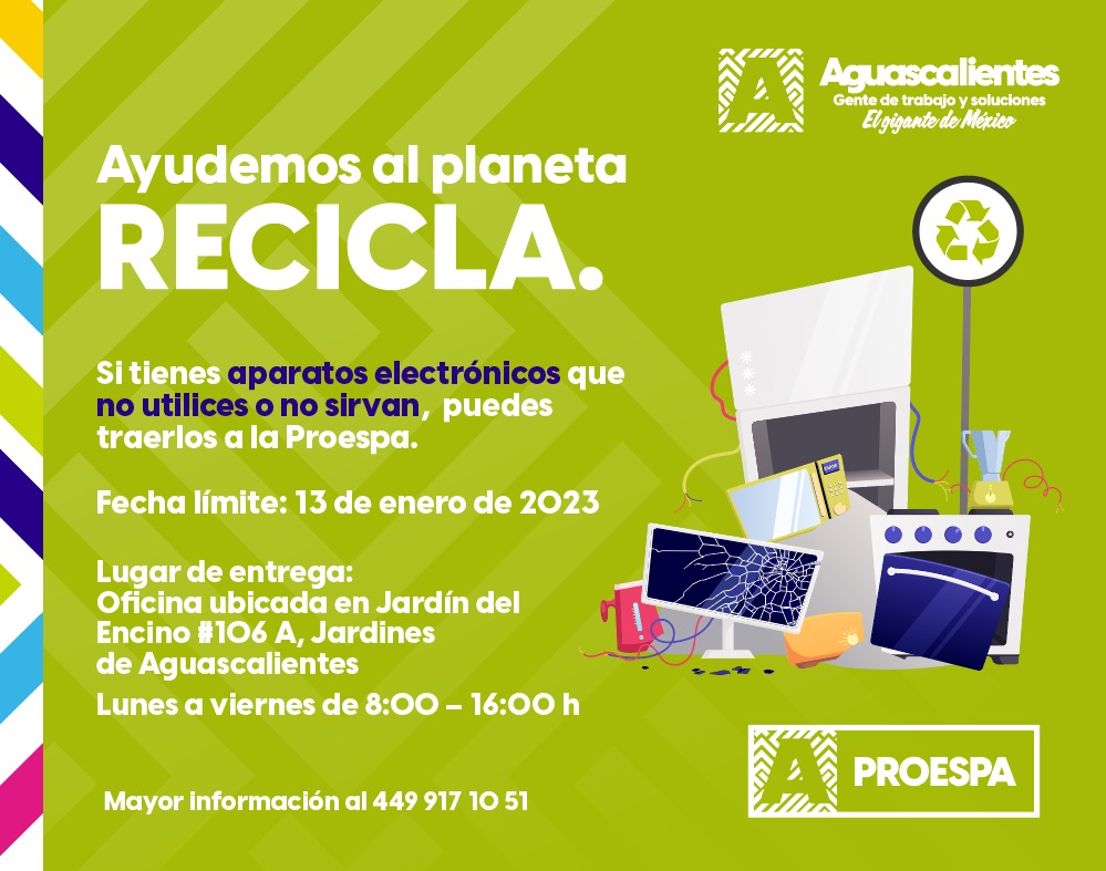 Los aparatos que se pueden entregar son: celulares, cargadores, tablets, teclados, monitores, radios, televisores, entre otros, y serán recibidos en las instalaciones de la PROESPA, ubicadas en Jardín del Encino #106 A, Jardines de Aguascalientes, de lunes a viernes, de las 8:00 a las 16:00 horas.