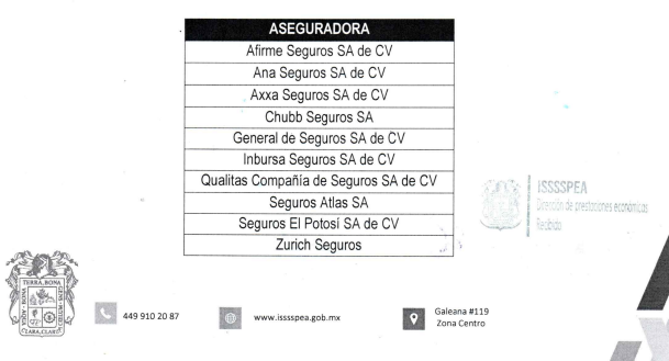 Los servidores públicos y pensionados, estatales y municipales de Aguascalientes reciben del ISSSSPEA prestaciones de seguridad y servicios sociales, entre estos, seguros e indemnizaciones por defunción, gastos funerarios, retiros e incapacidad permanente. Para esto, el Instituto debe asignar a un encargado de seguros, en este caso bajo el nombre de Gerardo Ruiz Esparza Piña.