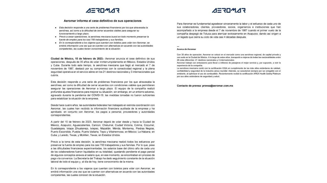 A través de un comunicado de prensa, la aerolínea Aeromar, anunció su cese de operaciones después de casi 40 años de funcionamiento, esto debido a la fuerte crisis financiera por la que atravesaba la compañía desde hace varios años y que se vió agravada por la pandemia de Covid-19, de esta manera, a partir del 15 de febrero Aeromar canceló todos sus vuelos de manera definitiva.