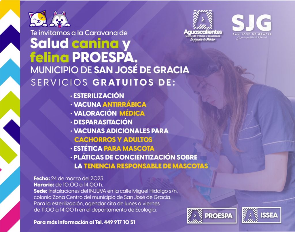 El Gobierno del Estado, a través de la Procuraduría Estatal de Protección al Ambiente (PROESPA), invita a los propietarios de mascotas del municipio de San José de Gracia a la Caravana de la Salud Canina y Felina que se llevará a cabo este viernes 24 de marzo.