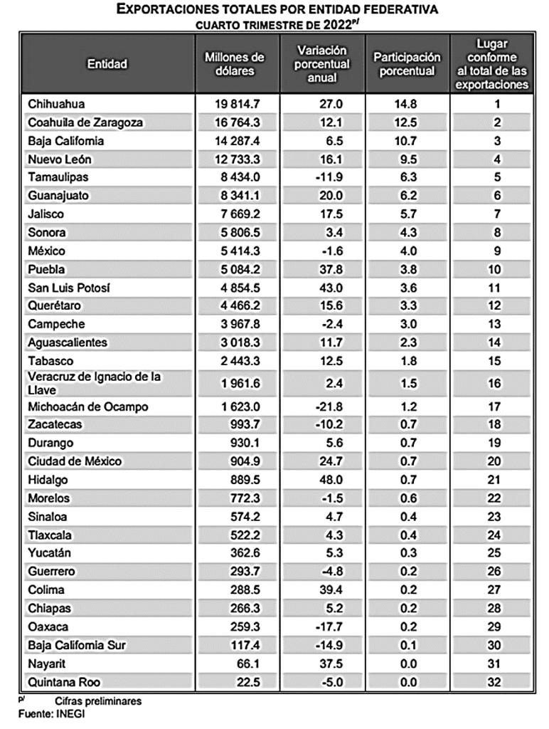 En el cuarto trimestre de 2022, los estados con mayor contribución al valor total de las exportaciones fueron: Chihuahua (14.8 %), Coahuila (12.5 %), Baja California (10.7 %), Nuevo León (9.5 %) y Tamaulipas (6.3 %). En conjunto, estas entidades sumaron 53.8 por ciento.