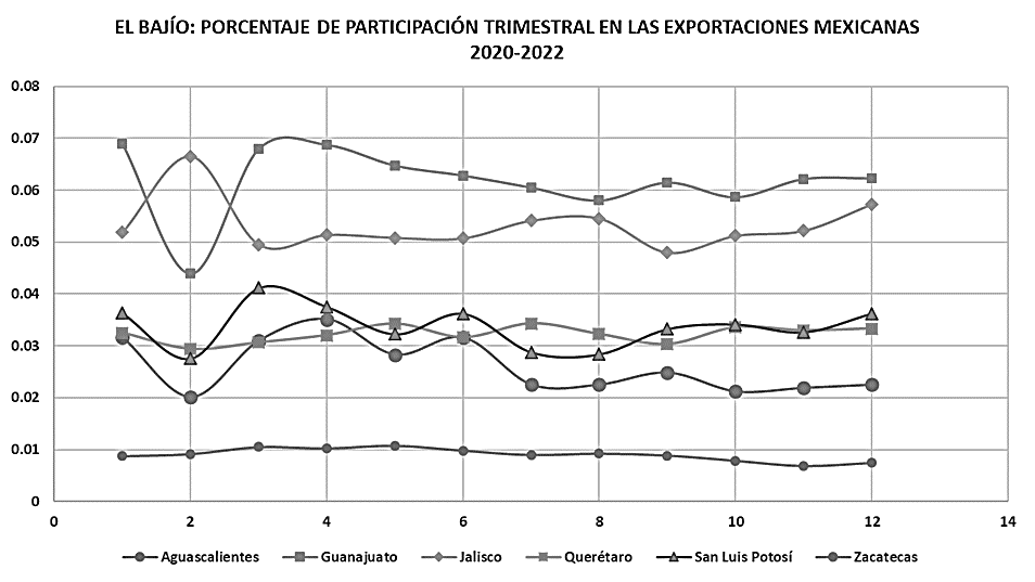 Las entidades de El Bajío, particularmente las más dedicadas a la industria manufacturera, presentaron una baja sensible en sus exportaciones durante la pandemia; siendo particularmente notable en el caso de Guanajuato; San Luis Potosí y Aguascalientes tuvieron un comportamiento semejante a la baja y ahora al alza, aunque Aguascalientes aún sin llegar a tomar sus valores prepandémicos a diferencia de San Luis que ya recuperó los iniciales.
