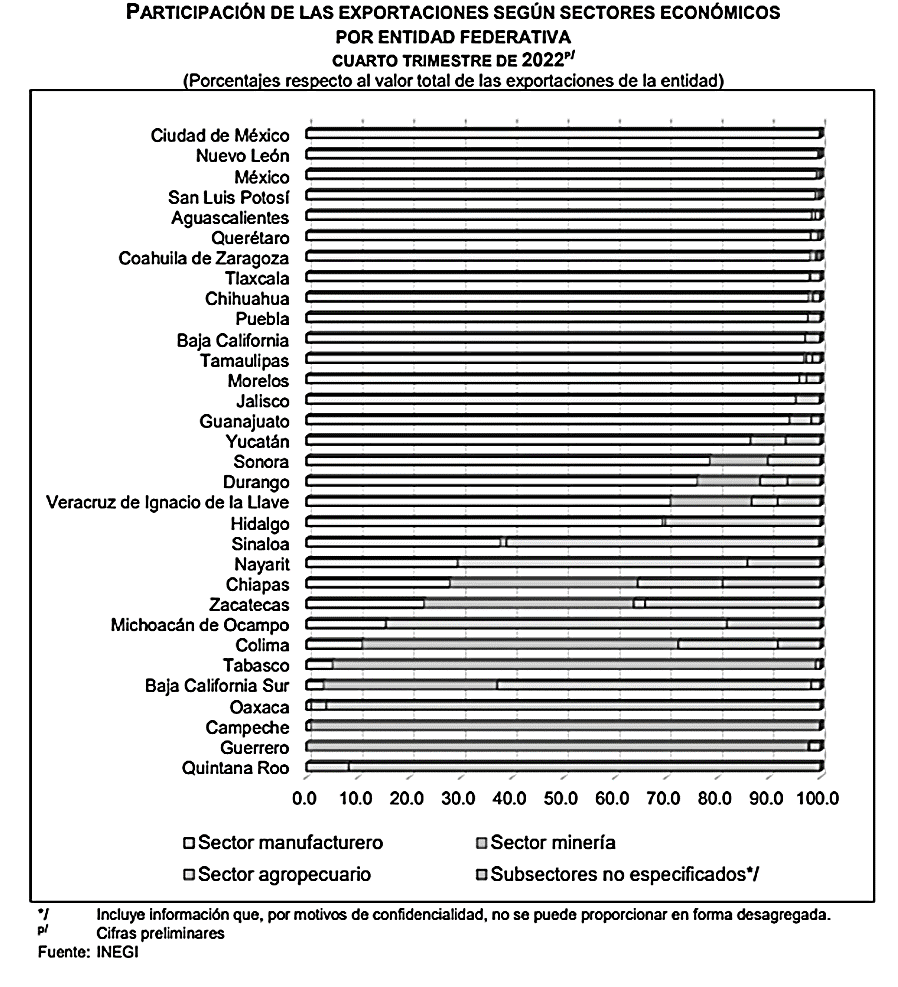 INEGI reportó las exportaciones manufactureras hasta el cuarto trimestre de 2022, por sector de actividad económica, mismas que representaron 90 % del valor total de las exportaciones de las entidades federativas, seguidas de las de minería (petrolera y no petrolera), con 6.8 % y las del sector agropecuario, con 3.2 por ciento. A tasa anual, el valor de las exportaciones de las entidades federativas se incrementó un 11.8 por ciento. Por sectores económicos, las exportaciones de manufacturas aumentaron 13.6 %, las agropecuarias, 1 % y las de minería disminuyeron 2.9 por ciento.