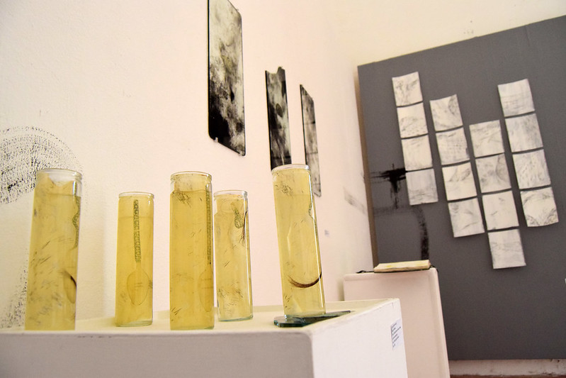 “Las diferentes manifestaciones gráficas son aplicadas a distintos soportes; placas de metal carcomidas por el ácido y el tiempo, papeles delicados deshaciéndose en el agua o grabado sobre delgadas hojas de acetato. Todos ellos no solo como reflexiones sobre el recuerdo y la memoria sino también como cuestionamientos de lo que entendemos como grabado tradicional.