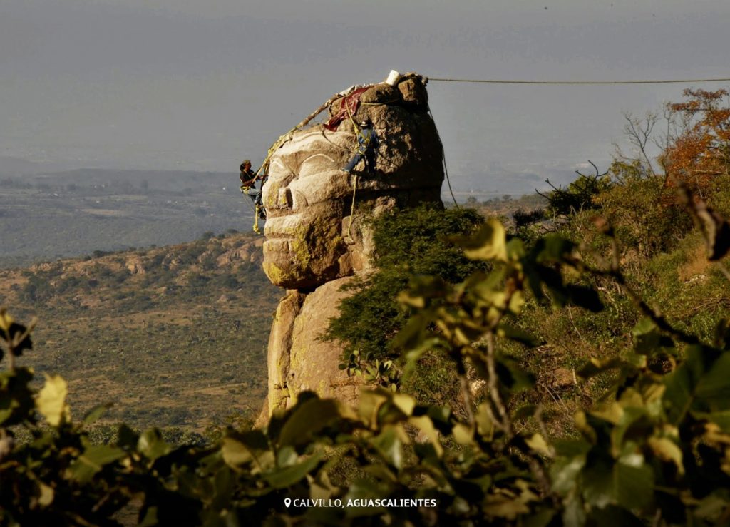 En la foto observamos la Gran Cabeza Chichimeca, que yace en la carretera 70, Aguascalientes-Calvillo, km. 33, entre la Sierra del Laurel y la Sierra Fría. Mide 12 metros de alto y es una obra de Juan Justo Zárate.
