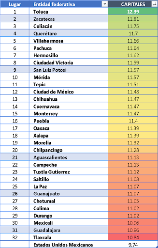En el caso de las capitales de los estados la situación se comporta diferente: tenemos al frente de las 32 ciudades a Toluca del EDOMEX con 12.39 años de escolaridad que es una escolaridad superior a la de preparatoria; seguida de Zacatecas con 11.81 y Culiacán 11.75 años. Santiago de Querétaro pasó a tener 11.7 y San Luís Potosí 11.57; Aguascalientes capital se quedó en 11.13 y Guanajuato en 11.07; la capital del vecindario regional con menor escolaridad es Guadalajara con solo 10.96 años.