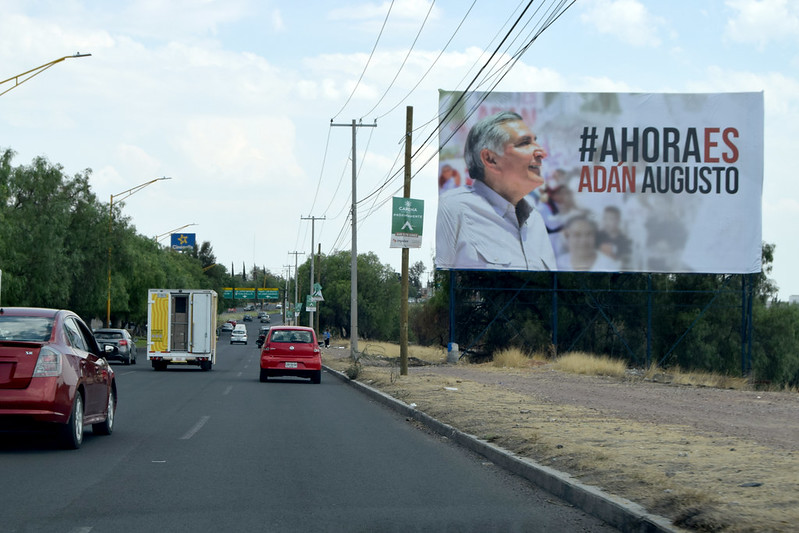 Lo cierto es que en el municipio de Aguascalientes el bombardeo visual es penetrante, con el #EsClaudia, y ciertas variantes, se cuentan por cientos los espacios que se ocupan en las bardas y ya con anterioridad se había desplegado una campaña en espectaculares con la posicionada silueta de la política; el #AhoraesAdánAugusto cuenta también con sus bardas pero llama más la atención cómo acapara espectacular tras espectacular en los anillos periféricos de la ciudad; si bien #ConMarceloSí es más reducido en cantidad, igual se ve la propaganda de extremo a extremo de la ciudad. Monreal es quien, salvo casos contados, no figura en esta competencia.