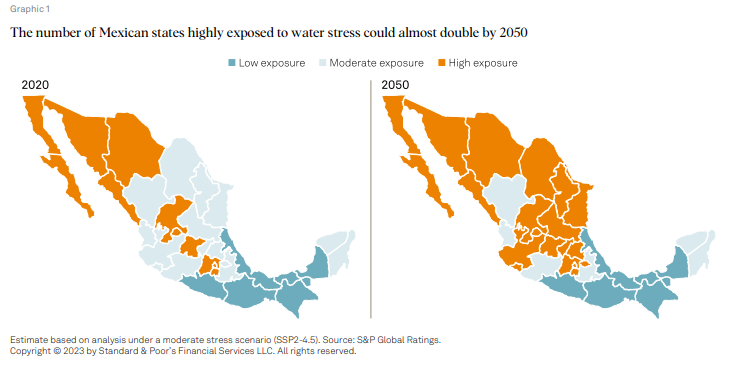 S&P muestra que ya son varios los territorios que presentan un elevado riesgo de estrés hídrico, a los cuales se sumarían más para el año 2050. Las entidades marcadas con mayor riesgo incluyen varios centro urbanos densamente poblados, como la Ciudad de México, Jalisco y Nuevo León, así como toda la zona norte del país.