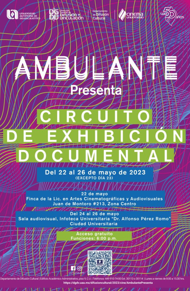 La Universidad Autónoma de Aguascalientes, a través de la Dirección General de Difusión y Vinculación (DGDV), el Departamento de Difusión Cultural y Cinema Universidad, hacen un llamado a formar parte de “Ambulante”, proyecto que, desde su creación, ha tenido la misión de abrir una ventana a la exhibición de trabajos de cine documental y atender el interés de una audiencia que demanda proyecciones de manera permanente.