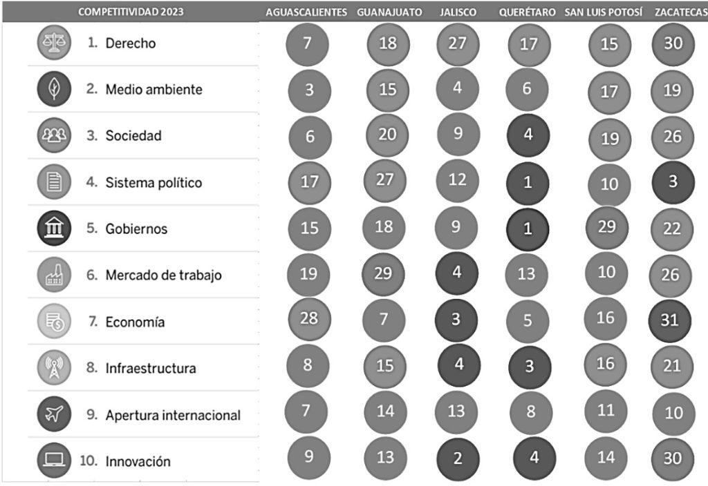 - En Economía, El Bajío contiene diferencias hasta de 28 lugares entre Jalisco (3°) y su vecino Zacatecas (31°) presenta una pérdida de posiciones en el caso de Aguascalientes con cinco puestos. El estado que más avanza respecto al 2022 en la materia fue Guanajuato con ocho lugares.