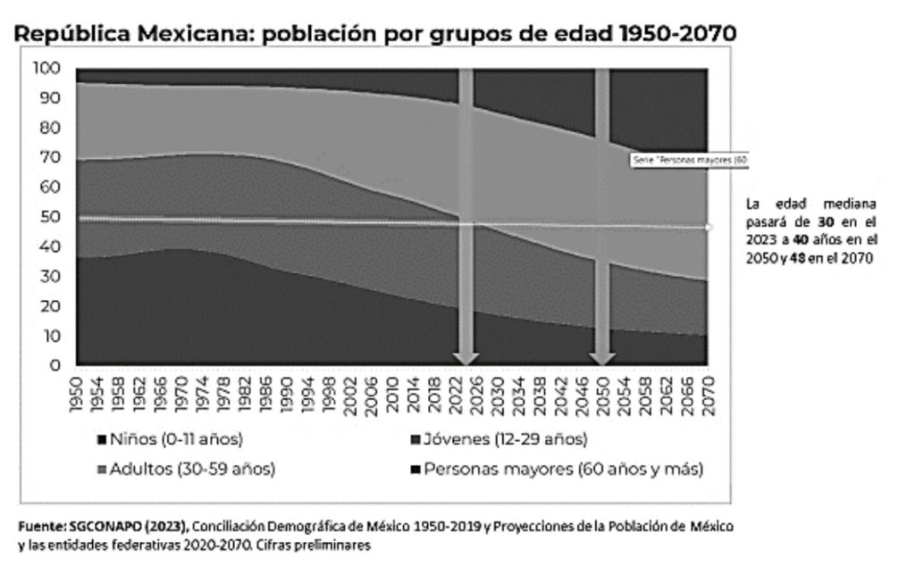 Partiendo de la base de “Las proyecciones de la población de México. El futuro demográfico de los próximo 50 años”, elaborado por el Consejo Nacional de Población (Conapo), el grupo de adultos mayores aumentará exponencialmente, pues al año 2070 los jóvenes, que hoy representan el mayor volumen de los mexicanos, tendrán más de 60 años y serán un tercio de los habitantes, efectivos con necesidad de pensiones y cuidados.