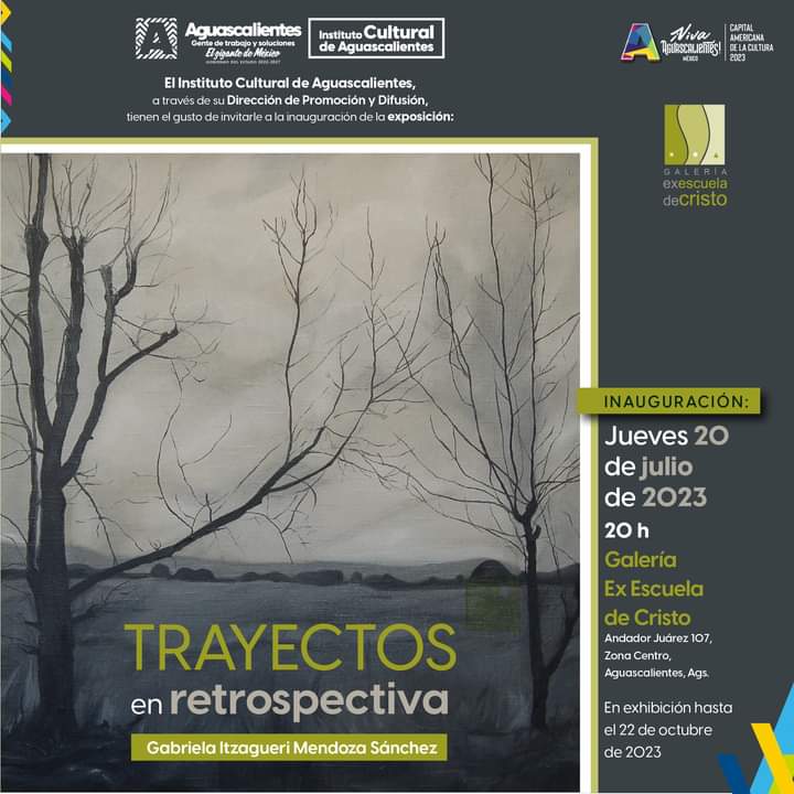 El Instituto Cultural de Aguascalientes invita a la inauguración de “Trayectos en retrospectiva”, de la artista hidrocálida Gabriela Itzagueri Mendoza Sánchez, que se llevará a cabo el jueves 20 de julio a las 20:00 horas en la Escuela de Cristo (Andador Juárez #107, Zona Centro).