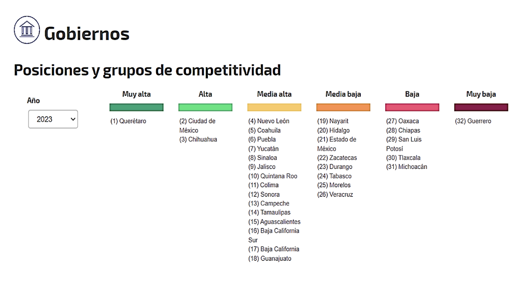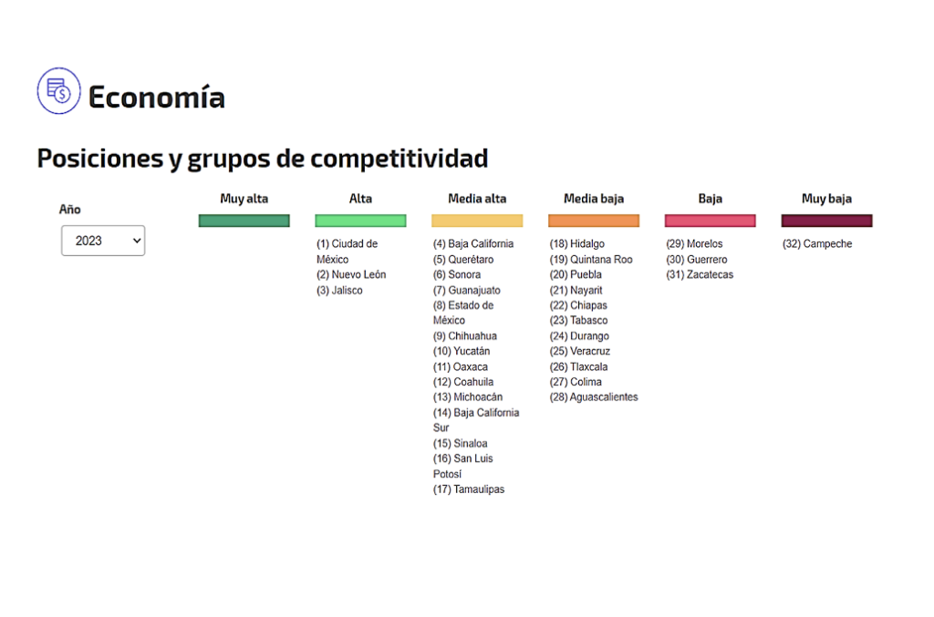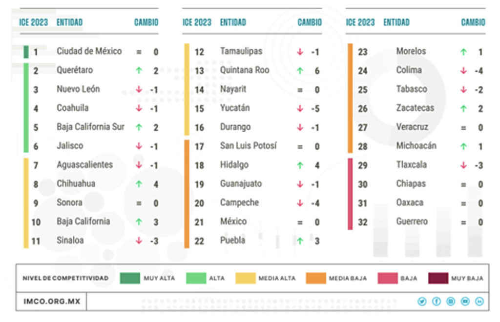- En la edición 2023 la Ciudad de México, Querétaro y Nuevo León se ubican en los tres primeros lugares, mientras que Guerrero permanece como la entidad con competitividad más baja.