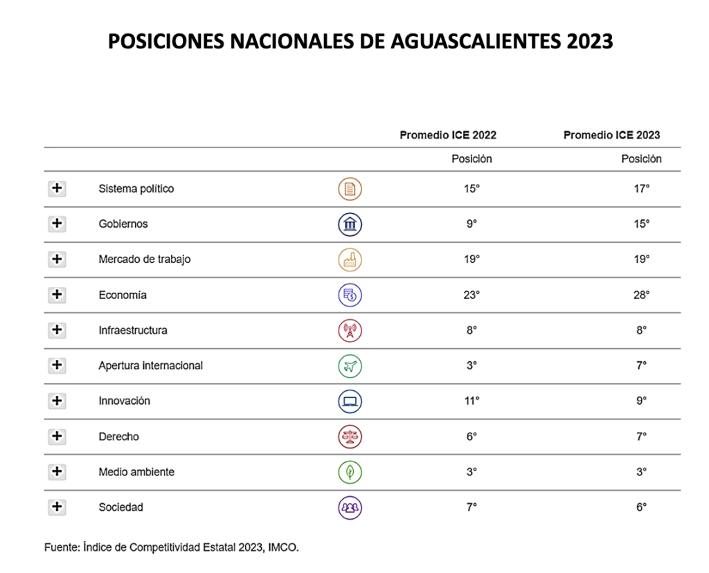 Aguascalientes disminuyó ligeramente su competitividad para ubicarse en el 2023 en el 7° lugar. En el vecindario regional tenemos a Querétaro en el 2° (subió dos lugares), Jalisco en el 6°, (bajó un lugar), San Luís Potosí continuó en el 17°; Guanajuato en el 19° (bajó un lugar), y Zacatecas en el 26° (subió dos lugares).