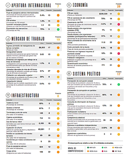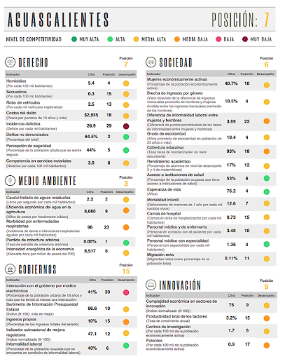 En la boleta de Aguascalientes se destacan en rojo, la baja interacción de la sociedad con el gobierno por medios electrónicos, y el (de)crecimiento la economía. Con nivel de competitividad muy baja tenemos la atención al crecimiento de la incidencia delictiva. Por el otro lado, destaca una decena de sub indicadores en verde, que le permiten ostentar el 7° lugar nacional.