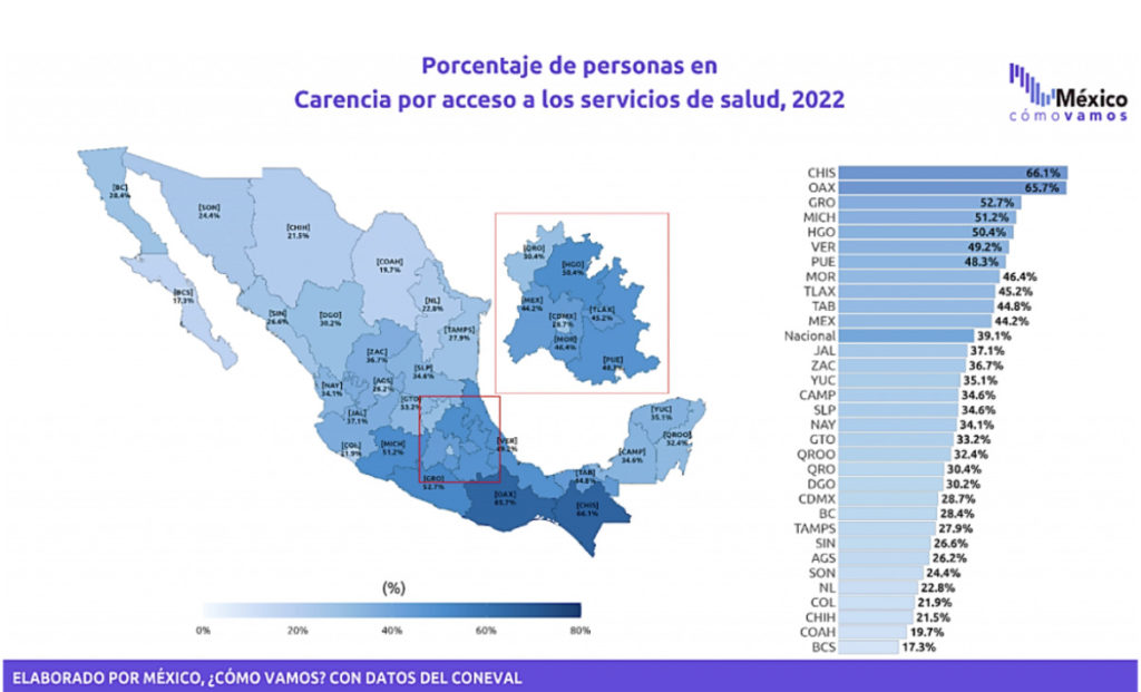 Presentan el mayor porcentaje de personas en carencia por acceso a servicios de salud: Chiapas (66.1%), Oaxaca (65.7%) y Guerrero (52.7%). Mientras que las entidades con menor porcentaje en este rubro son Baja California Sur (17.3%), Coahuila (19.7%) y Chihuahua (21.5%).