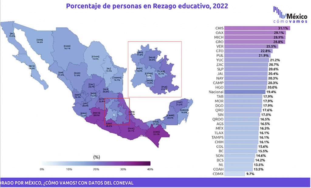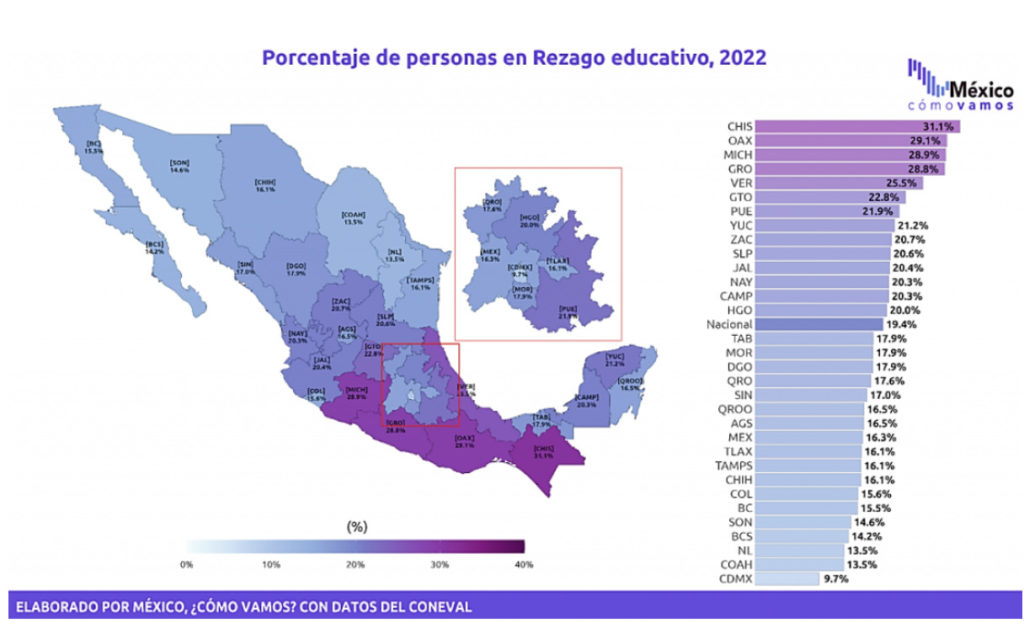 Las entidades con menor porcentaje de personas en rezago educativo son Ciudad de México (9.7%), Coahuila (13.5%) y Nuevo León (13.5%). En contraste, Chiapas, Oaxaca y Michoacán presentan el mayor porcentaje de personas en rezago educativo con porcentajes de 31.1%, 29.1% y 28.9%, respectivamente; de hecho, Chiapas y Oaxaca presentan el mayor rezago a nivel nacional tanto en acceso a servicios de salud, como en rezago educativo.