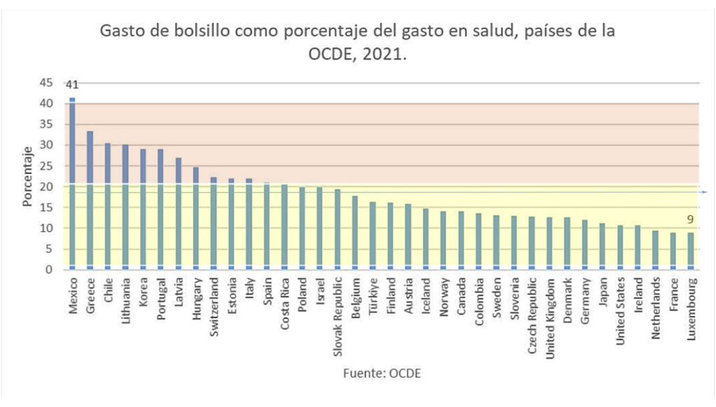 Finalmente, la OCDE revela que en México se ha incrementado en forma tal el gasto de bolsillo en salud que ya rebasó en términos porcentuales al resto de los 38 países miembros de la OCDE. Con el 41% del “gasto de bolsillo” como porcentaje del gasto en salud, ya duplica el promedio, que se encuentra por debajo del 20%.