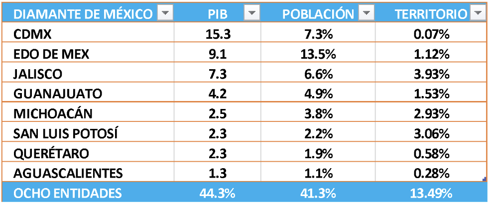 Haciendo un ejercicio sub nacional tenemos que, en nuestro país, en el denominado diamante de México, se ocupa menos del 14% del territorio, pero se produce más del 44% del PIB nacional.