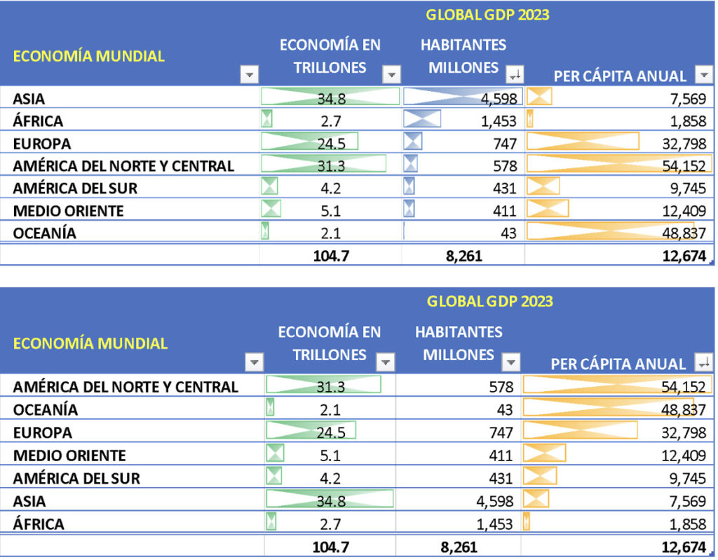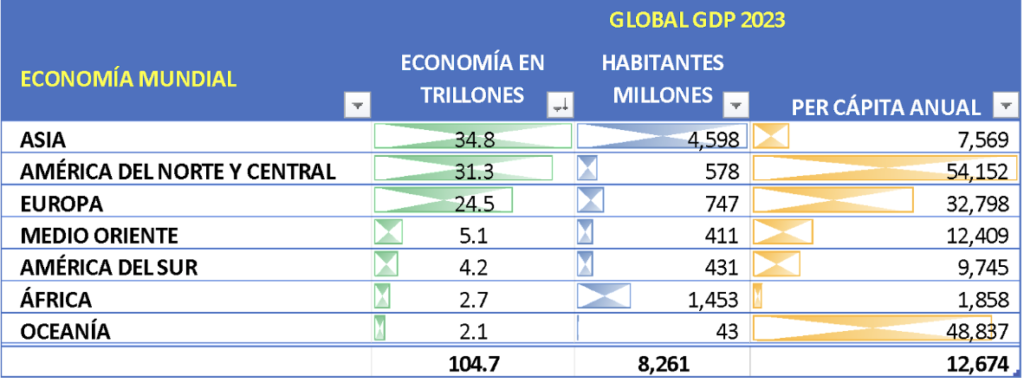 Así, el 34.8% de la economía mundial se genera en Asia, el 31.3 en América del Norte y Central y el 24.5% es europea. Sólo el 10% restante se produce en Medio Oriente, América del Sur, África y Oceanía.